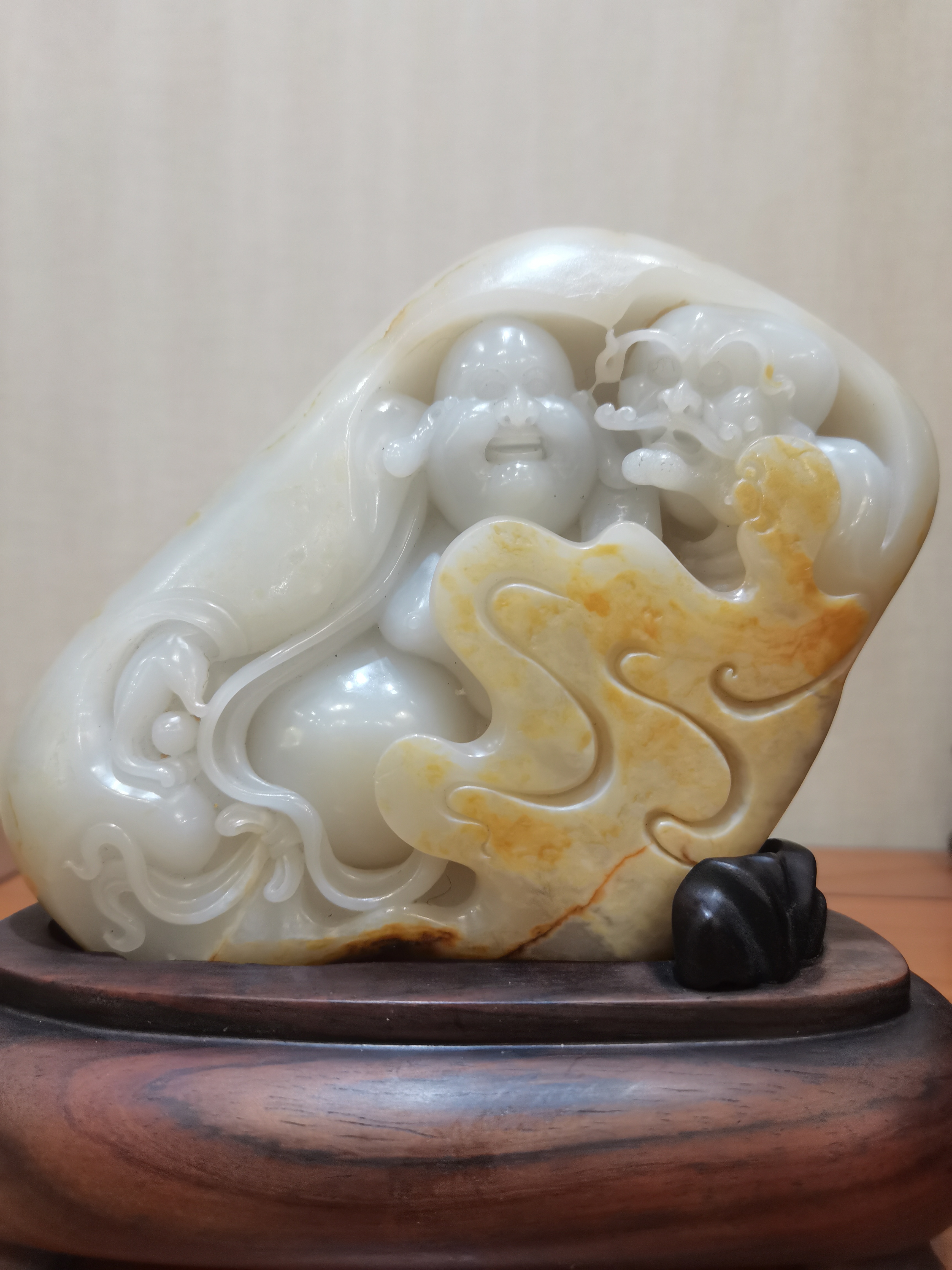 稀有的大塊獨籽雕刻,器型飽滿大氣,非常老熟的玉種,彌勒佛手持寶珠,衣袂飄飄。右邊雕刻羅漢,形象逼真。布局疏朗、層次分明,動感強烈,細節處理非常精細,曲線流暢自然,如行云流水。兩位仙人同時護佑康寧,乃洞天福地。
