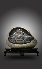 彌勒佛方臉凸頂,彎眉笑眼,鼻頭高挺,開臉較好,坦胸露腹。整體祥瑞充盈,增添了更多靈性及喜氣。彌勒大肚能容,容天下難容之事,笑口常開,笑天下可笑之人。警醒世人,凡事看開看遠,心情舒暢,笑對人生,才能心寬體胖,無憂人生,福氣自在眼前! 水膽瑪瑙,乃自然界形成的瑪瑙中包裹有天然形成的水,在瑪瑙制品中尤為稀罕。玉器雕琢工藝師們在挑選瑪瑙料石中,首先要確定其有“水”,再用切割機把瑪瑙切開,切開時又要恰到好處:切面離水膽遠了,看不見水;切得過近了,又容易把“膽”切破、破了“膽”的瑪瑙就失去了其雕琢的價值,一件成功的水膽瑪瑙雕件其雕琢之難和其工藝價值之珍貴。
